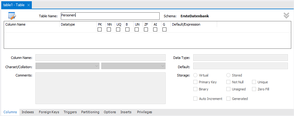 Nun wollen wir eine erste Beispieltabelle erzeugen – bislang aber noch ohne SQL-Befehle. Daher nutzen wir die grafische Benutzeroberfläche, die wir soeben kennengelernt haben.