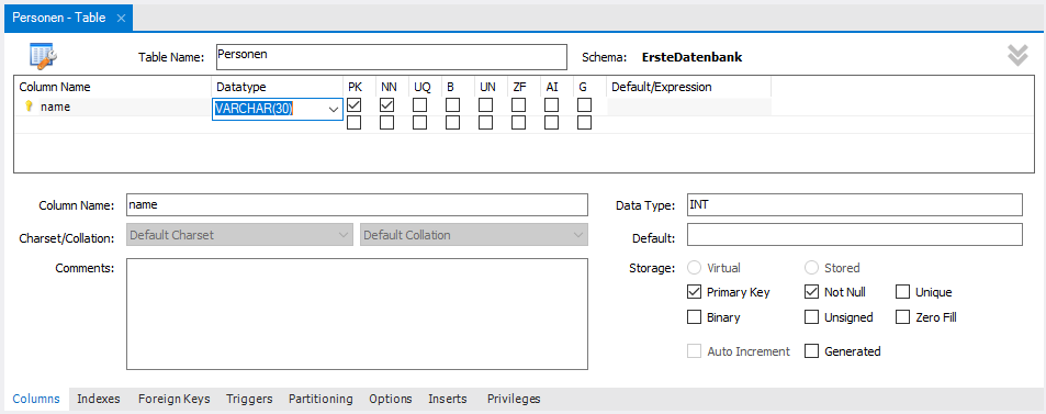 Hinter dem Namen wird die Bezeichnung INT angegeben. Dabei handelt es sich um die Art der Daten, die wir in der entsprechenden Spalte aufnehmen möchten. Darauf gehen wir später detailliert ein. An dieser Stelle sei nur erwähnt, dass INT für Zahlen steht.