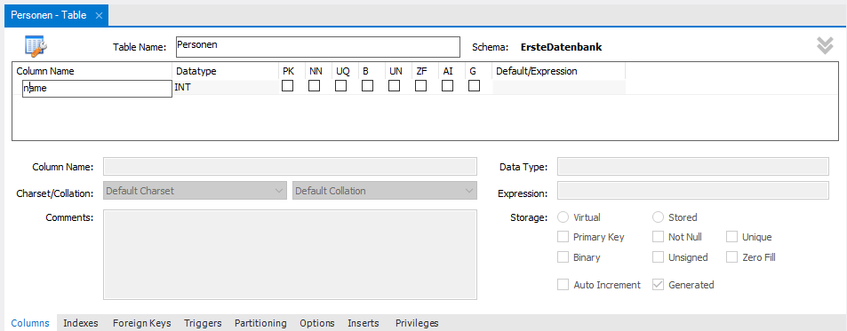 Jetzt fügen wir eine weitere Spalte für das Alter der Personen ein, ein, indem wir auf die nächste Zeile klicken und den Column Name auf alter ändern. Hierbei geben wir nun den Datentyp INT an.
